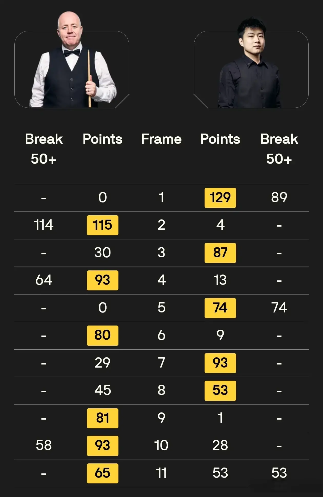 比赛开始后,赵心童快速进入状态,一上来就单杆打出89分拼抢开局占据主动。希金斯随即还以颜色单杆破百114分追平比分。第三局赵心童在激烈的火花碰撞中以87-30拿下。第四局希金斯单杆64分再次追平比分。第六局赵心童单杆74分再次领先。希金斯零敲碎打历经上手以80-9拿下,前六局不分伯仲3-3握手言和非常激烈。接下来赵心童突然发力在拉锯战中赢下两局缠斗以5-3抢到了赛点。绝境之下希金斯连追两局来到5-5平。决胜局一波三折赵心童率先拿到53分,但是最后的关键红球没进,希金斯上手拿下本局,最终挽救赛点6-5绝杀赵心童,成为首个晋级四强的球员!