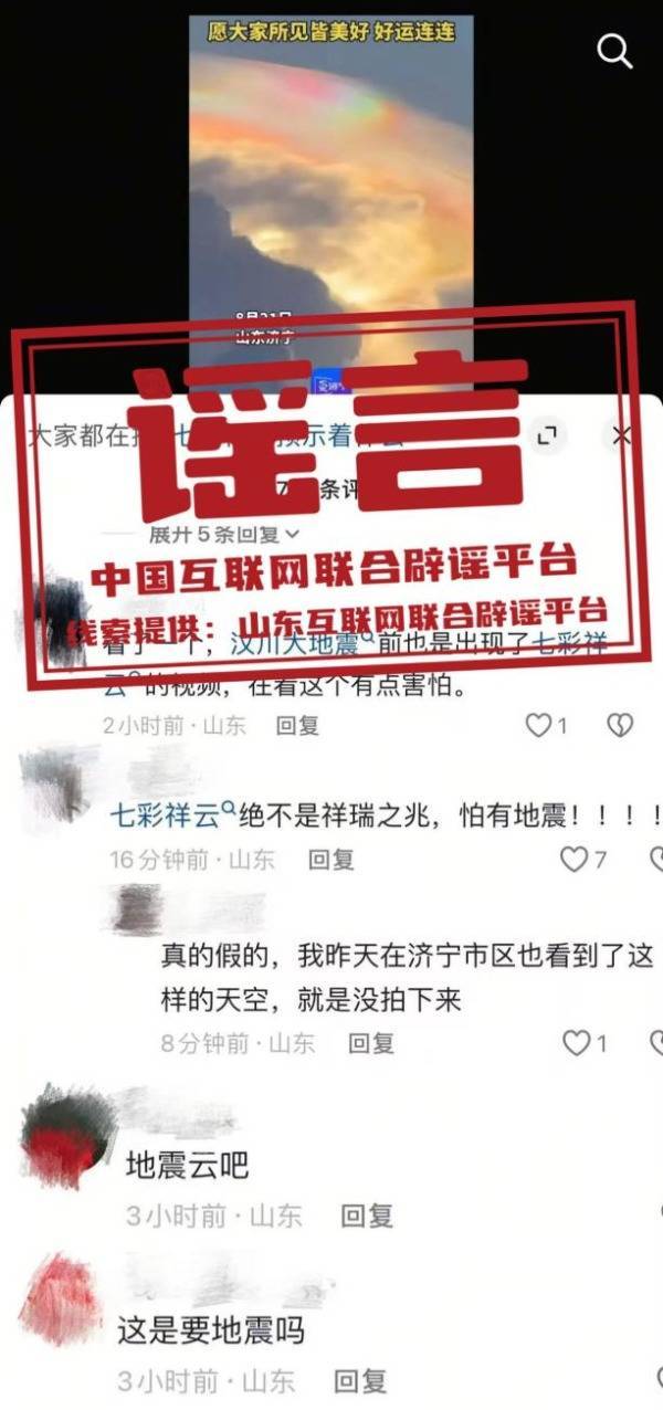 真相:近日,山东济宁多地市民观察到天空中出现大片色彩斑斓、形态似羽毛或波浪的云层,许多人称之为“祥云”,有部分网民将它与“地震预测”的民间说法相关联,称是“地震云”“不是祥瑞之兆,是要地震”。